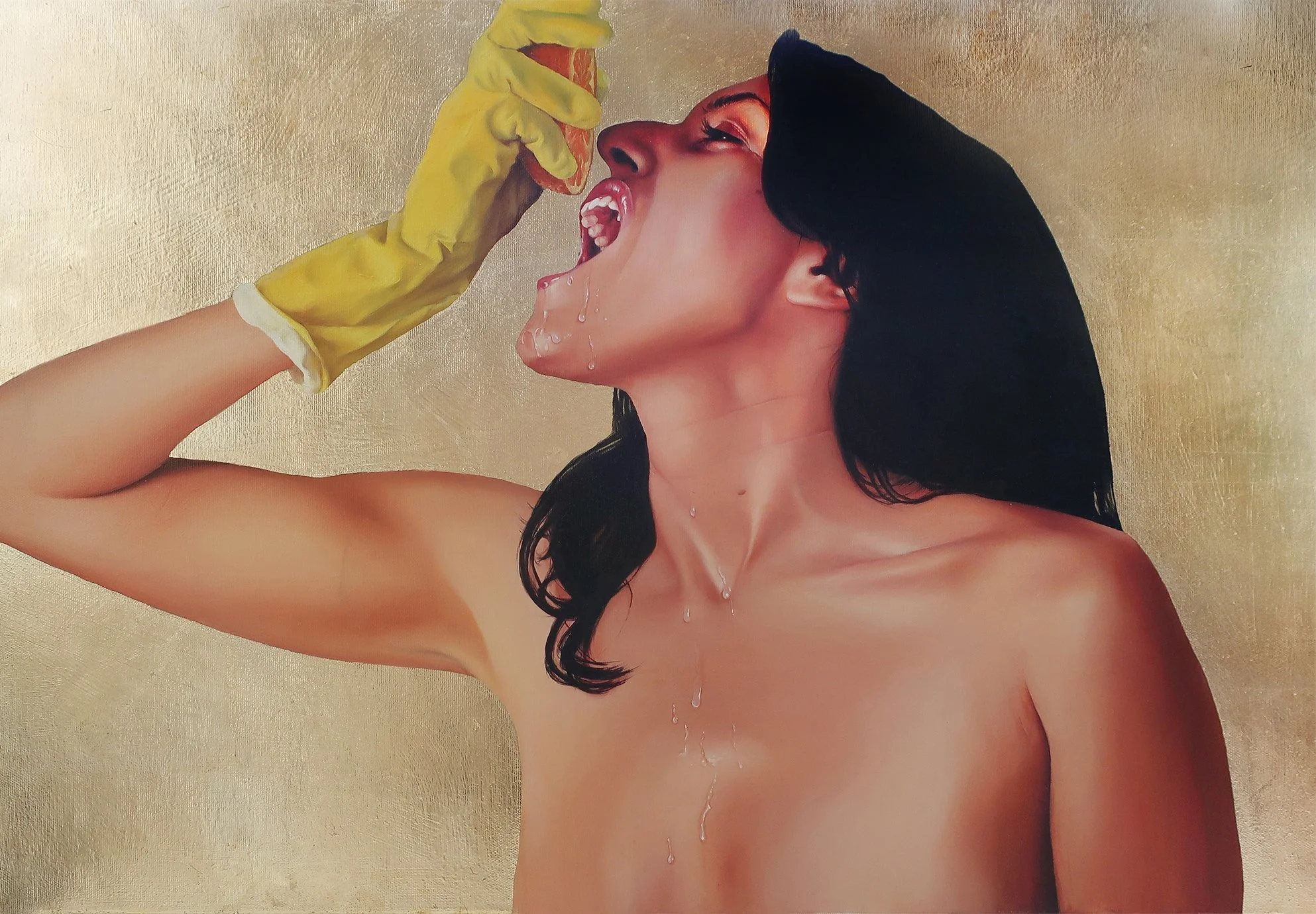 The body here is both subject and surface. Metallic grounds and carefully staged gestures reflect the mechanisms of visual culture back at the viewer, the way certain images demand to be looked at, and the way that demand is built.